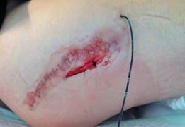 De draine (rechts) wordt verwijderd uit de wond. De wond zelf is keurig netjes met nietjes dicht gemaakt. De wondpijn is dragelijker geworden.De fysiotherapeut is al op bezoek geweest. Morgen de eerste stapjes…