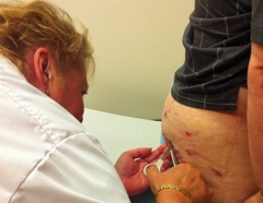 De draine (rechts) wordt verwijderd uit de wond. De wond zelf is keurig netjes met nietjes dicht gemaakt. De wondpijn is dragelijker geworden.De fysiotherapeut is al op bezoek geweest. Morgen de eerste stapjes…